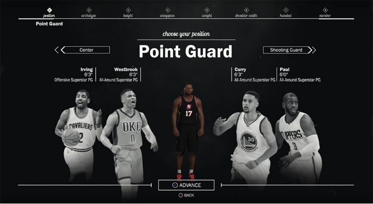when passing through each position, the myplayer stands in the center of the screen with two players of the same position on his right and left sides, as well as said player's name, height, and their playstyle. for example, stephen curry is listed as 6'3 "and labeled" all-around superstar pg. "