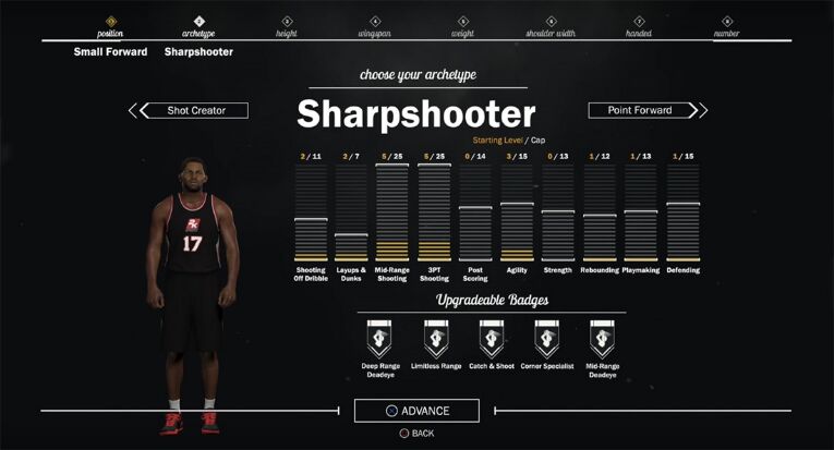 listed below the attribute groups are "upgradable badges," five of which come with each archetype, meaning one's myplayer will start his journey with a couple of predetermined badges. a "sharpshooter" has deep range deadeye, limitless range, catch & shoot, corner specialist, and mid-range deadeye to start.